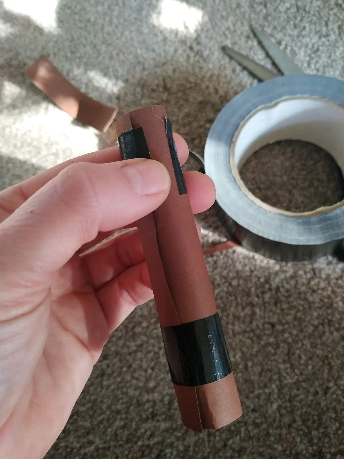 Weil uns das mit beiden Augen nur schwer gelingt, nimmt man einen Motivsucher zur Hilfe. Der besteht aus einem Stück festem Papier (ungefähr 10x10 cm) und Klebeband. (Ich habe braunen Tonkarton genommen. Dann sieht es ein bisschen wie ein Fernrohr aus J) Das Papier wird gerollt und an den Enden mit Klebeband in Form gehalten.